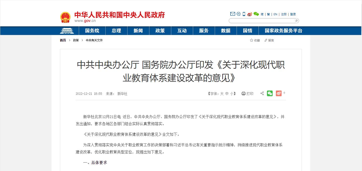 國務(wù)院印發(fā)《關(guān)于深化現代職業(yè)教育體系建設改革的意見(jiàn)》